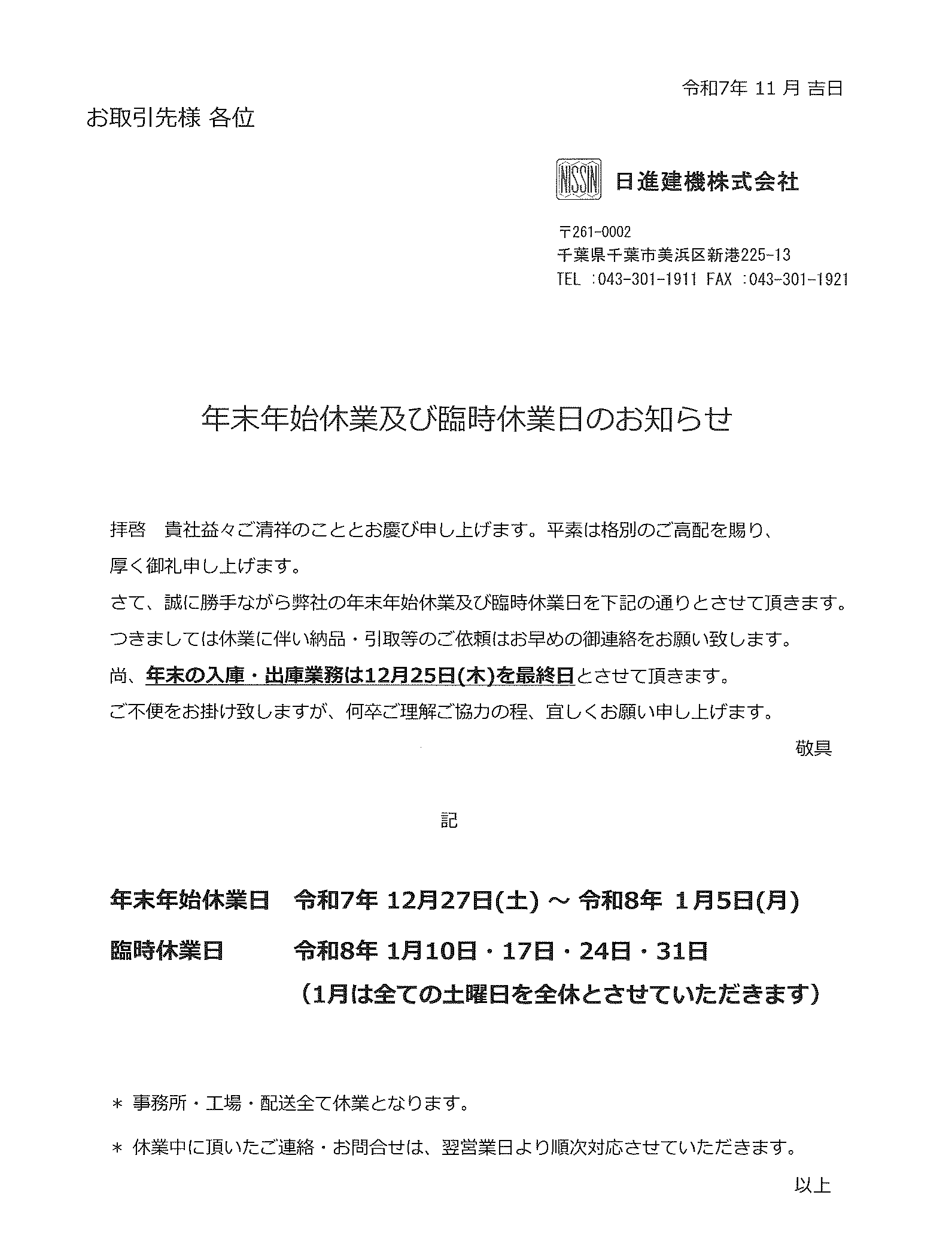 2025年~2026年 年末年始休業のお知らせ